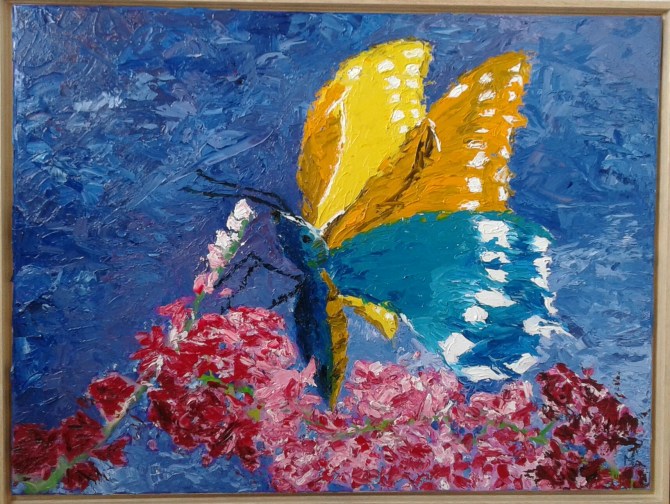 This painting is one of two paintings in different styles. This one is very colourful and made with oil paint and a palette knife.