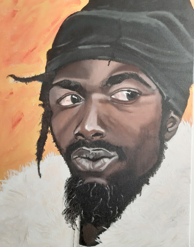 The reggae artist relaxing on a Sunday morning, thinking about his music. This painting I painted with oil paint, and the background with acrylic, it was nice to paint him on a moment he didn’t pose.
