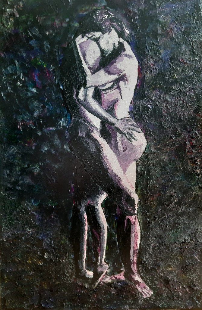 This is something I tried and found it very difficult, because I painted it with acrylics and used sand and tea to make a structure, it is a big painting for me it’s 75 cm x 120 cm when it’s dark you see the figures coming out of the dark.This painting is for sale.