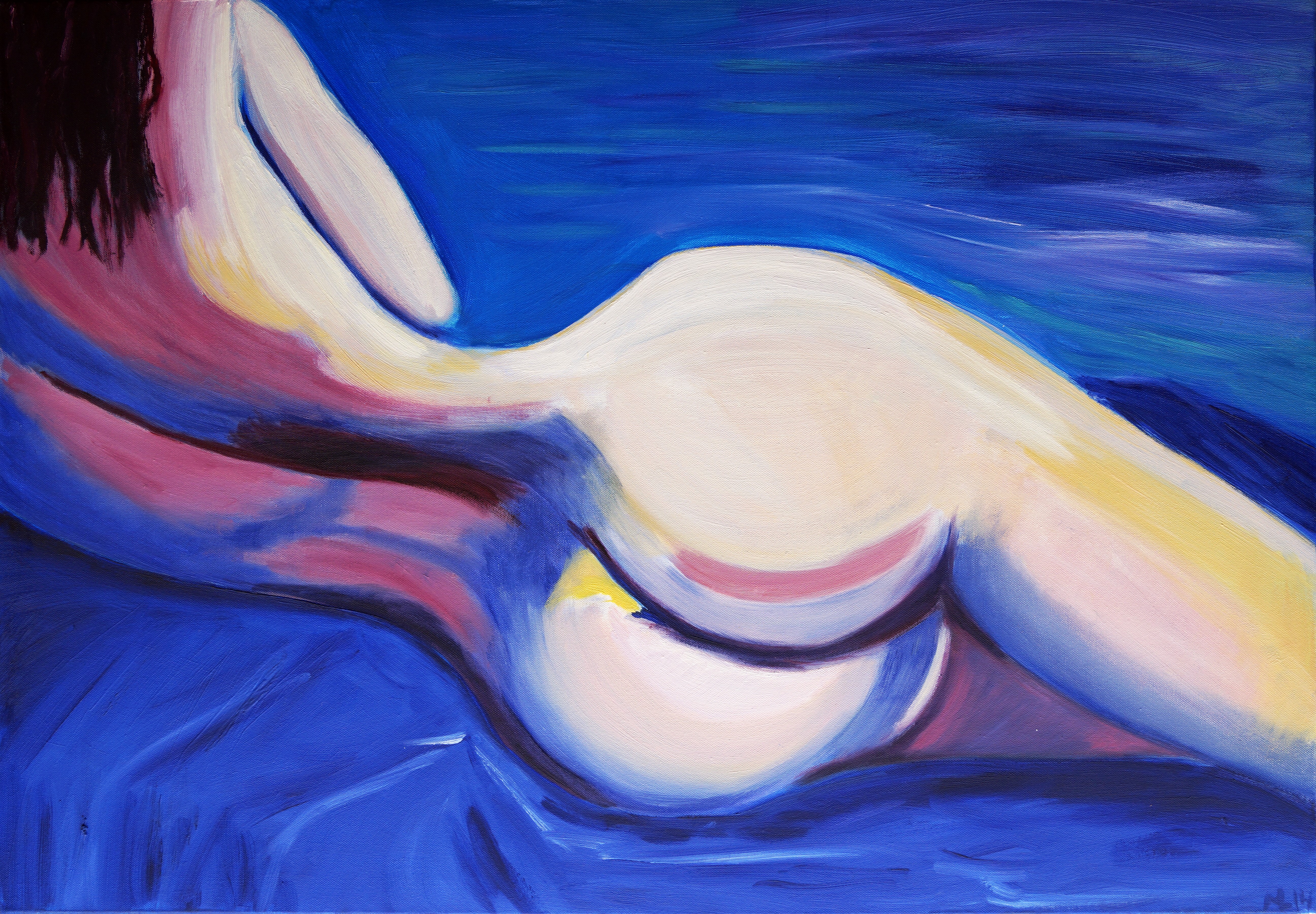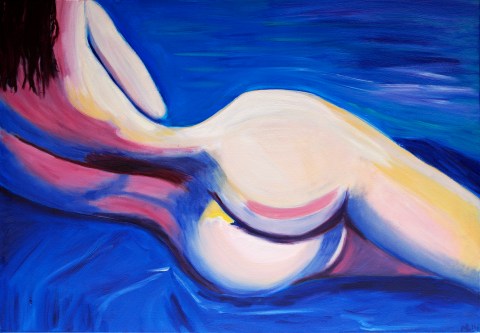 Woman In Blue Posted on April 19, 2015 by Marianne Libregts Art Feminine beauty dressed in blue and nothing more 🙂 Painted in oil, on canvas. Size 70 x 100 cm (28 x 39 inch). For sale. Peace & Lots of Love, Marianne